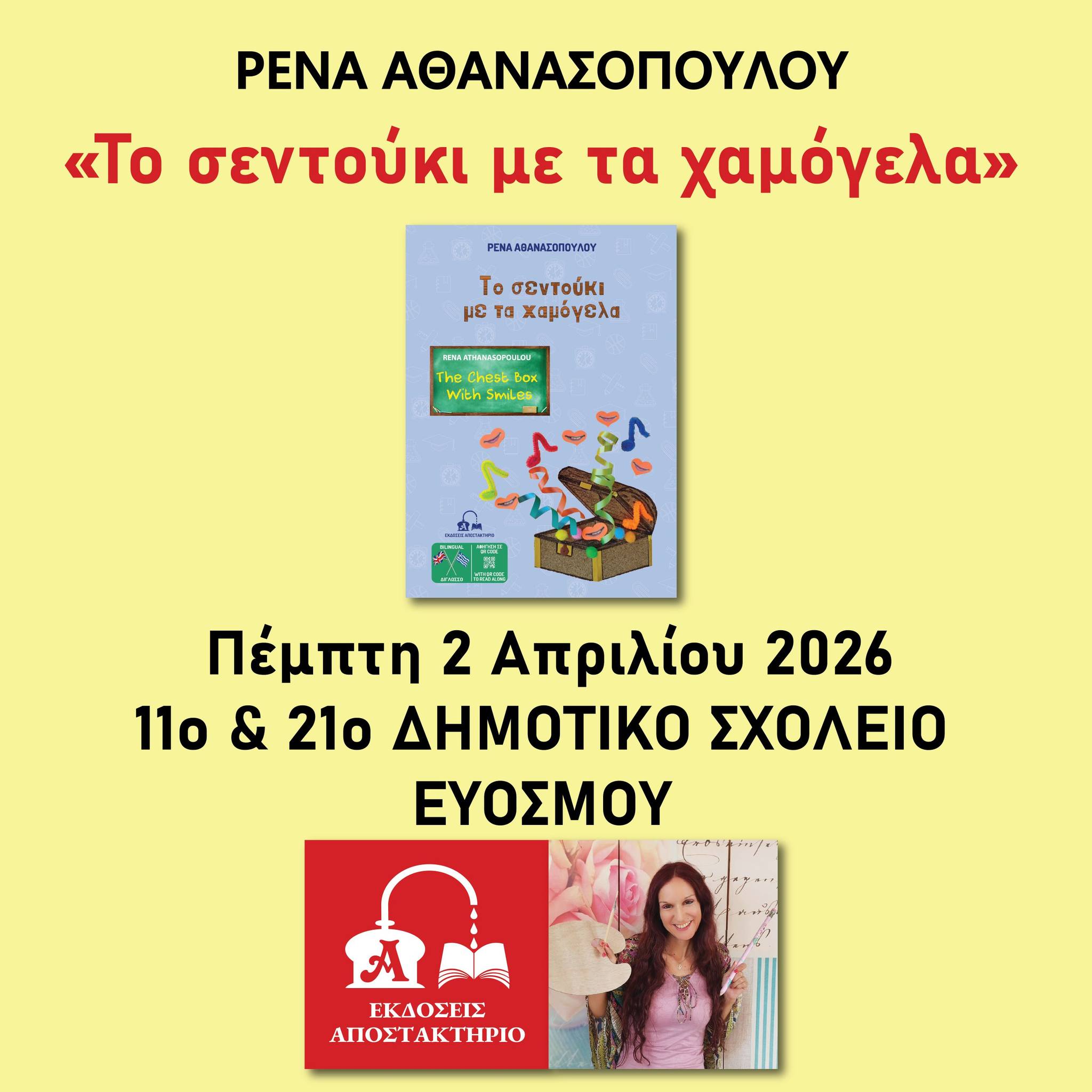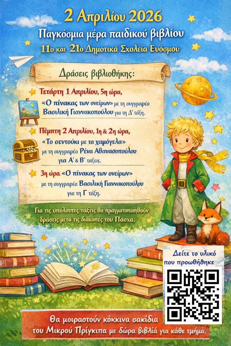 Με τεράστια χαρά γιόρτασα την Παγκόσμια Ημέρα Παιδικού Βιβλίου (2-4-26) με τους μαθητές της Α' και Β' Τάξης του 11ου και 21ου Δημοτικού Σχολείου Ευόσμου. "Το σεντούκι με τα χαμόγελα" πλημμύρισε με τις πρωτότυπες ιδέες και τη μοναδική ευαισθησία τους! Ευχαριστώ ολόψυχα την υπεύθυνη εκπαιδευτικό των σχολικών βιβλιοθηκων κυρία Παρθενόπη Νασούφη που με προσκάλεσε και με υποδέχτηκε με τον πιο όμορφο τρόπο μαζί με τους απίθανους μαθητές της!