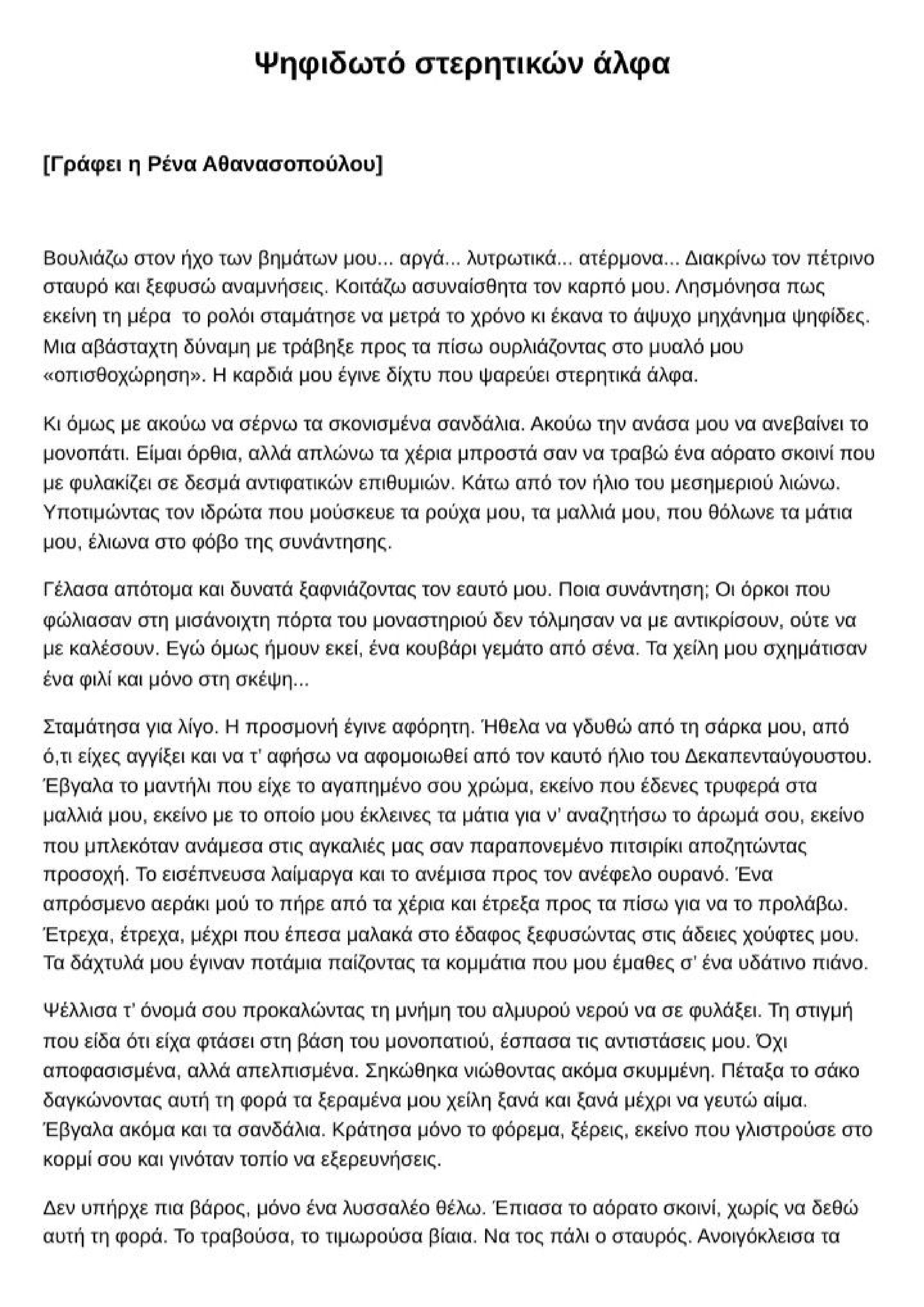 Διήγημα της Ρένας ΑθανασοπούλουΒουλιάζω στον ήχο των βημάτων μου... αργά... λυτρωτικά... ατέρμονα... Διακρίνω τον πέτρινο σταυρό και ξεφυσώ αναμνήσεις. Κοιτάζω ασυναίσθητα τον καρπό μου. Λησμόνησα πως εκείνη τη μέρα το ρολόι σταμάτησε να μετρά το χρόνο κι έκανα το άψυχο μηχάνημα ψηφίδες. Μια αβάσταχτη δύναμη με τράβηξε προς τα πίσω ουρλιάζοντας στο μυαλό μου «οπισθοχώρηση». Η καρδιά μου έγινε δίχτυ που ψαρεύει στερητικά άλφα.