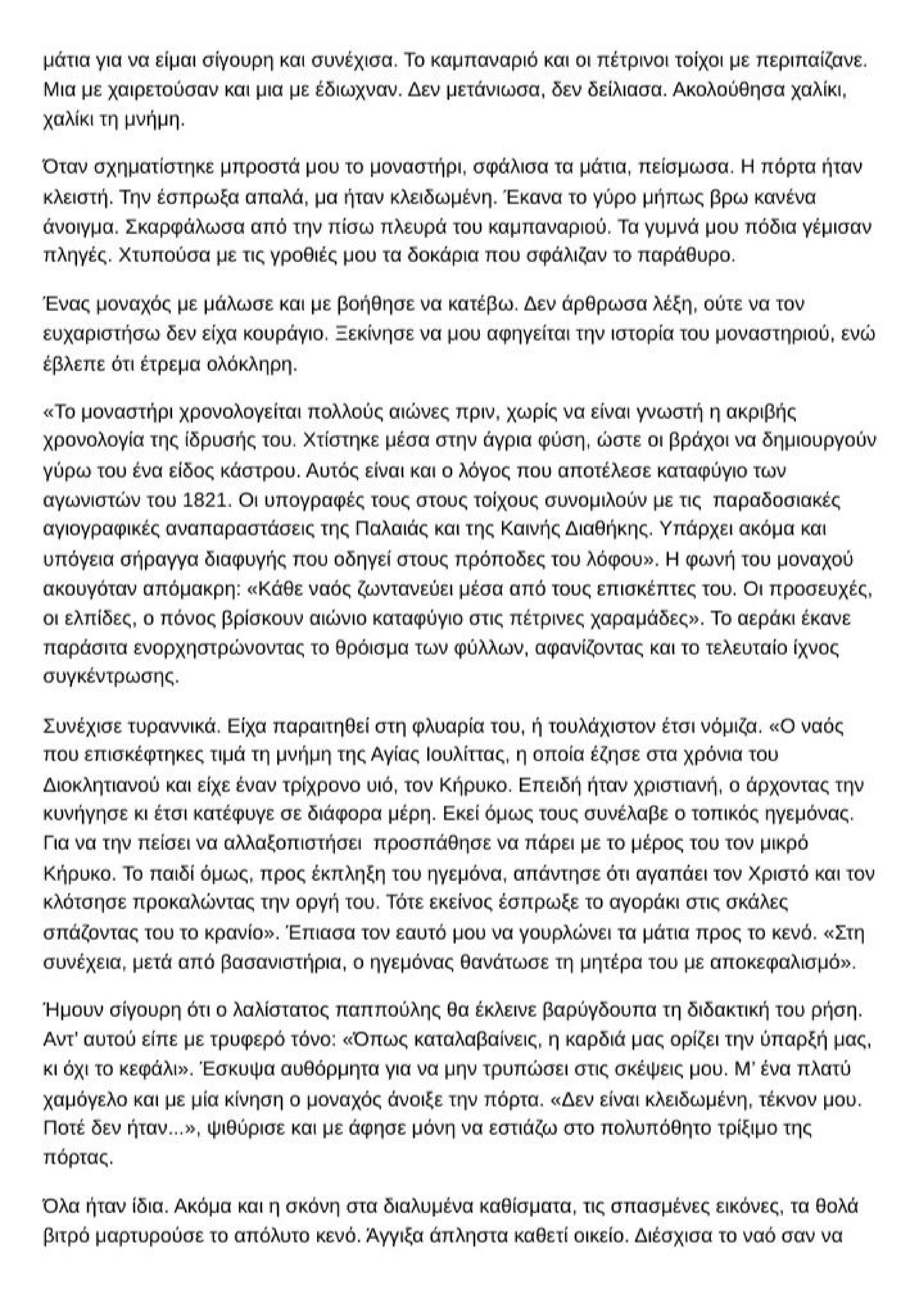 «Το μοναστήρι χρονολογείται πολλούς αιώνες πριν, χωρίς να είναι γνωστή η ακριβής χρονολογία της ίδρυσής του. Χτίστηκε μέσα στην άγρια φύση, ώστε οι βράχοι να δημιουργούν γύρω του ένα είδος κάστρου. Αυτός είναι και ο λόγος που αποτέλεσε καταφύγιο των αγωνιστών του 1821. Οι υπογραφές τους στους τοίχους συνομιλούν με τις παραδοσιακές αγιογραφικές αναπαραστάσεις της Παλαιάς και της Καινής Διαθήκης. Υπάρχει ακόμα και υπόγεια σήραγγα διαφυγής που οδηγεί στους πρόποδες του λόφου[1]». Η φωνή του μοναχού ακουγόταν απόμακρη: «Κάθε ναός ζωντανεύει μέσα από τους επισκέπτες του. Οι προσευχές, οι ελπίδες, ο πόνος βρίσκουν αιώνιο καταφύγιο στις πέτρινες χαραμάδες». Το αεράκι έκανε παράσιτα ενορχηστρώνοντας το θρόισμα των φύλλων, αφανίζοντας και το τελευταίο ίχνος συγκέντρωσης.