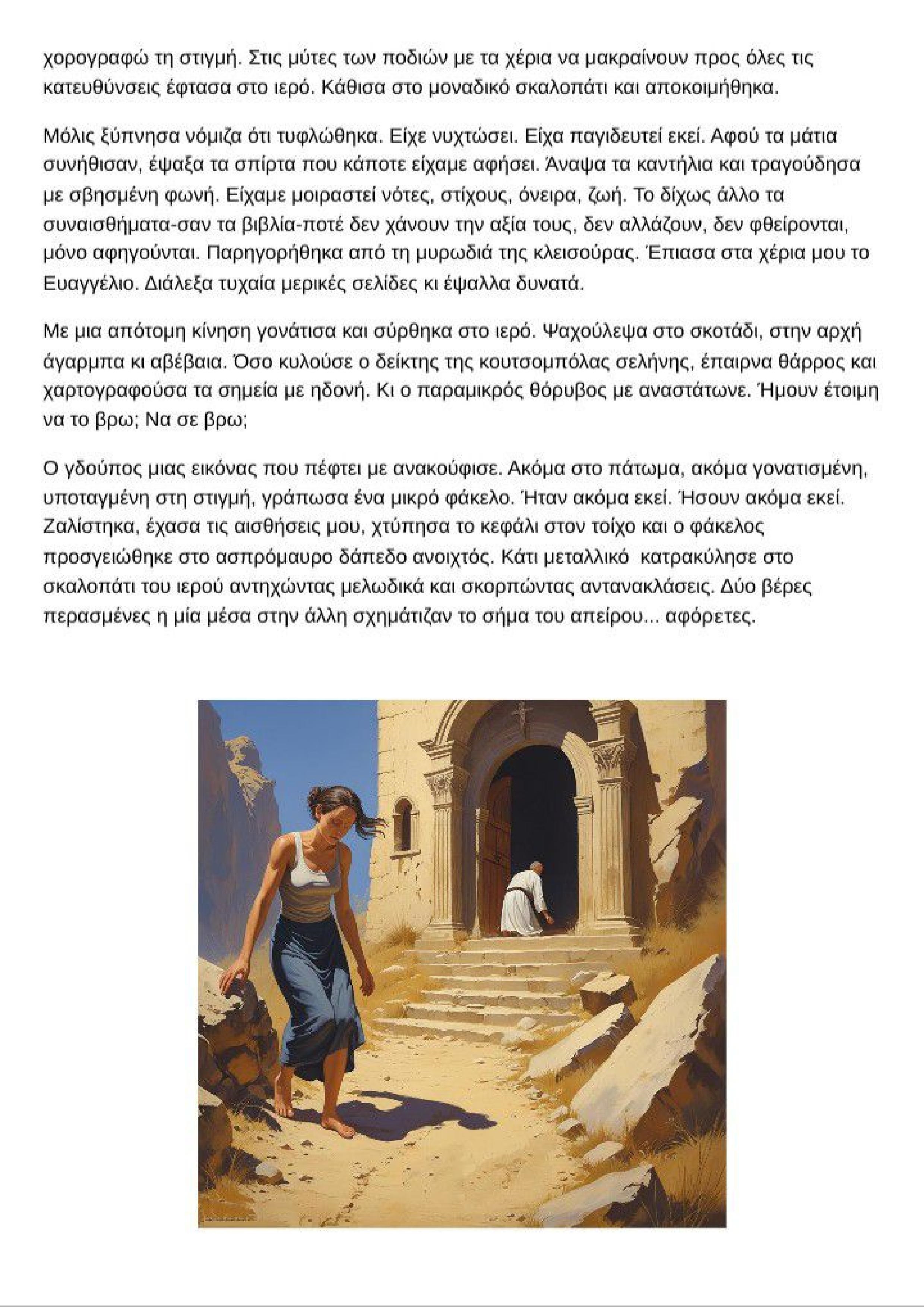 Όταν σχηματίστηκε μπροστά μου το μοναστήρι, σφάλισα τα μάτια, πείσμωσα. Η πόρτα ήταν κλειστή. Την έσπρωξα απαλά, μα ήταν κλειδωμένη. Έκανα το γύρο μήπως βρω κανένα άνοιγμα. Σκαρφάλωσα από την πίσω πλευρά του καμπαναριού. Τα γυμνά μου πόδια γέμισαν πληγές. Χτυπούσα με τις γροθιές μου τα δοκάρια που σφάλιζαν το παράθυρο.